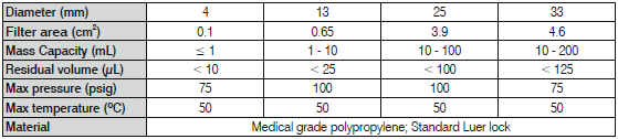 • Broad range of membrane types • HPLC / GC sample and solvent filtration • Standard Luer lock • Ultra-clean polypropylene housing, low dissolution, for trace analysis • Low residual volume • Convenient, cost-effective |