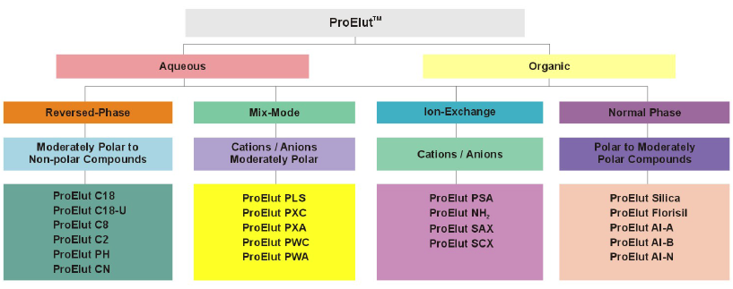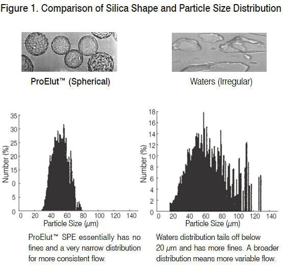 ProElut® SPE uses spherical silica with high purity and narrow particle size distribution as support. The spherical silica with fewer fines gives a more regular, stable and reproducible chromatography bed that gives a faster, more even flow rate for better separation. Fines cause back pressure increases that can result in clogging and can pass through filters and contaminate the final product. A narrower particle size distribution will give a more homogenous packing that will help in collecting more concentrated fractions and reducing solvent consumption to achieve higher recovery and reproducible results.
