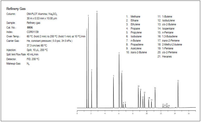 • Similar to GS-Alumina, HP-PLOT S, Alumina Sulfate PLOT, AT-Alumina, and CP-Al2O3 / Na2SO4 PLOT