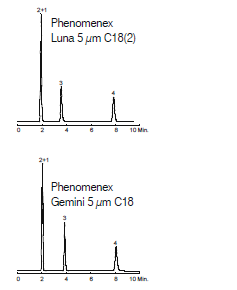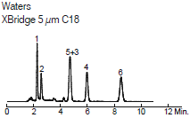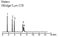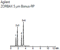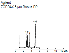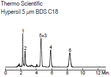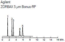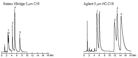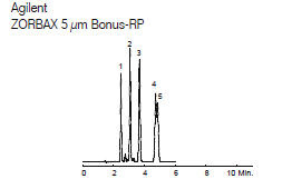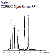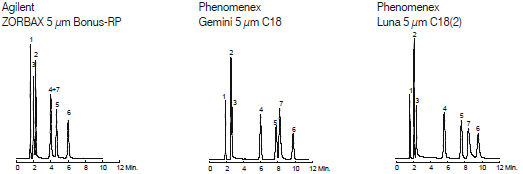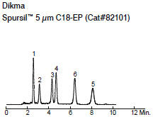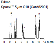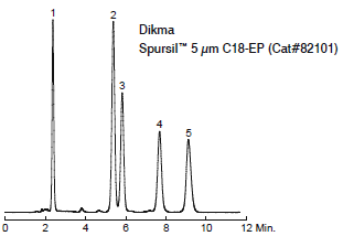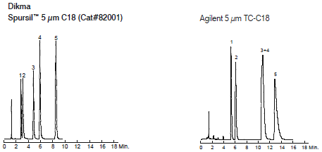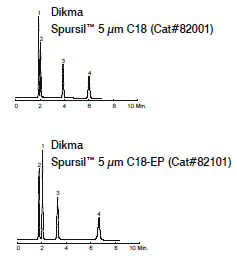 Standard reverse phase columns, particularly C18 columns, often suffer from "phase collapse" and the retention of the compounds is severely diminished when used in combination with highly aqueous phases. This phenomenon is substantially reduced with Spursil™ because the polar modifications make the phase less hydrophobic and more wettable. Polar-modified phases remain fully extended in aqueous phases, allowing increased interaction between samples and the bonded phase. Spursil™ columns show good retention of polar compounds which tend to elute in the void volume on standard ODS phases.