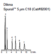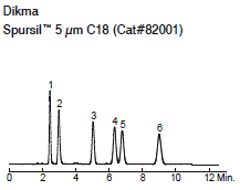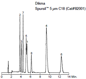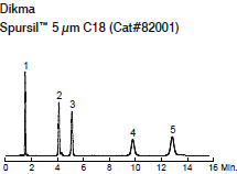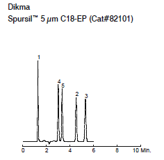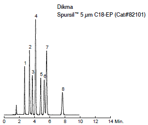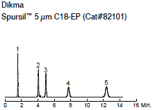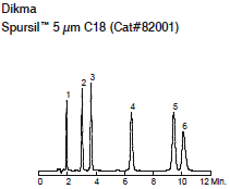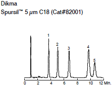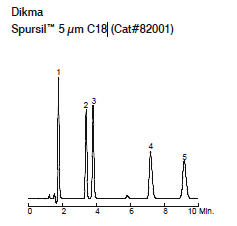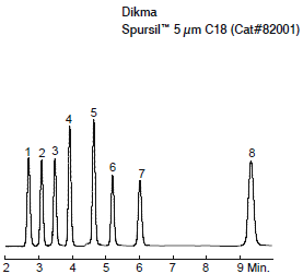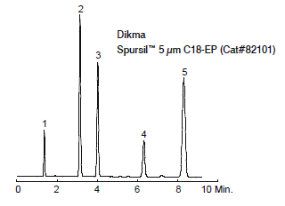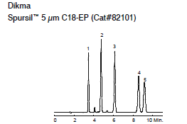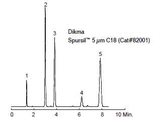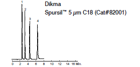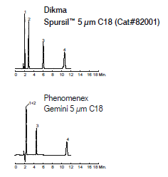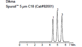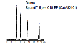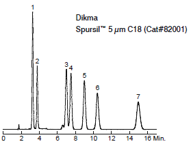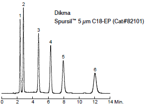 One of the most important parameters in choosing a column is lifetime. Columns that last longer save time and money. Column failure often occurs because of hydrolytic instability of the stationary phase and silica as well as mechanical instability of the column packing (voiding) . The high phase coverage of all Spursil™ products plus proprietary endcapping creates a phase that is more stable against hydrolytic attack. Dikma's narrow specifications on surface area of the silica help to create a more consistent and well-packed column that minimizes shifting of the column bed during use. This reduces the chance of voiding. With Spursil™ columns, there is no worry about bonded phase hydrolysis, dissolution of the silica particle, or bonded phase collapse. The polar groups make the Spursil™ columns highly stable in hydrophilic conditions, from pH 1.5 to 10 and from 0 to 100% aqueous. All Spursil™ columns are tested at pH 1.5 and pH 10 under "real world" conditions with basic and acidic compounds to ensure good peak symmetry.