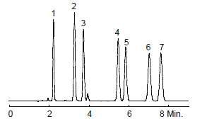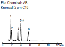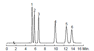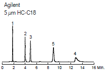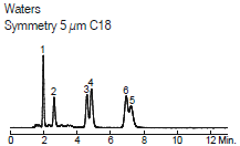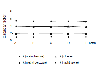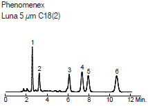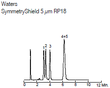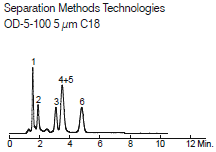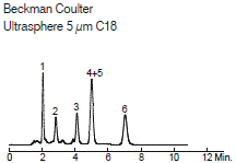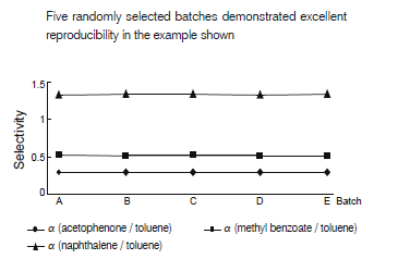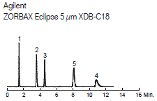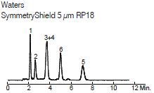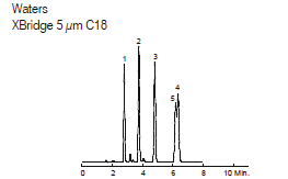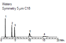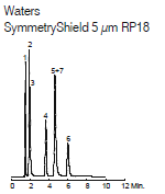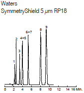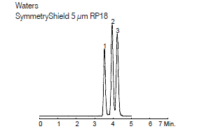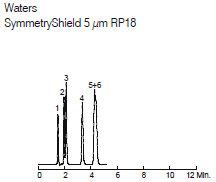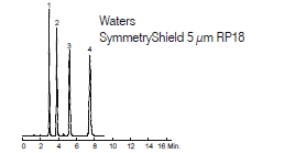 A chromatographic efficiency test is run on all columns. Plates per column and USP tailing factor are measured for each column to confirm packing efficiency. The USP tailing factor, a measure of peak symmetry at 5% of peak height, is a stringent indicator of peak shape. The test analytes are neutral hydrophobic compounds chromatographed in a acetonitrile: water mobile phase. The retention, selectivity, efficiency and peak symmetry of these molecules are measured to provide specifications for column performance.