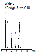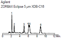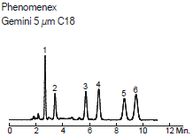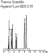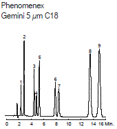 | The separation of nine caffeine metabolites, each a geostereoisomer of similar structure, demonstrates the resolving power for positional isomers. The Spursil™ C18 column completes this separation in less than 13 minutes, with remarkable selectivity. | |||||||||||||||||||||||||||||||||||||