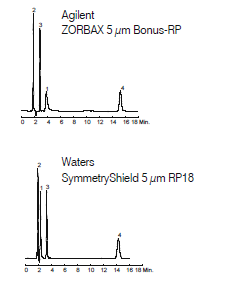 Spursil™ polar-modified phases are based on ultra high-purity silica and novel polar modification technology. The unique bonded phases maximize polar retention and selectivity, while virtually eliminating silanol activity. The resulting polar-modified packing material contains a surface which is easily "wetted" with polar eluents and can run in highly aqueous conditions. The polar group also seems to play a role in base deactivation. We have seen some evidence that hydrogen bonding occurs between certain polar linkers and the silica surface, thereby decreasing the interaction of such silanols with basic components in the sample. Additionally, polar-modified phases often provide selectivity quite different from standard C18 phases.
