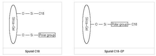 Conventional C18 columns often provide less retention for polar compounds. Spursil™ C18-EP column exhibits enhanced retention of polar compounds due to its unique embedded polar group design for the stationary phase. Enhanced retention of polar compounds results in a column that is compatible with the high aqueous mobile phases necessary for retaining these polar compounds.