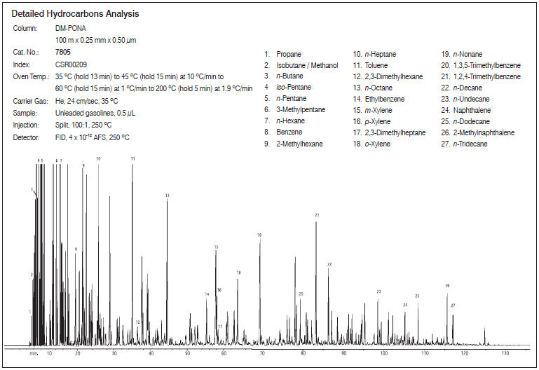 DM-PONA is a non-polar column for analysis of complex hydrocarbon compounds. Our rigorous QC method exceeds the ASTM method guidelines for resolution and retention time.